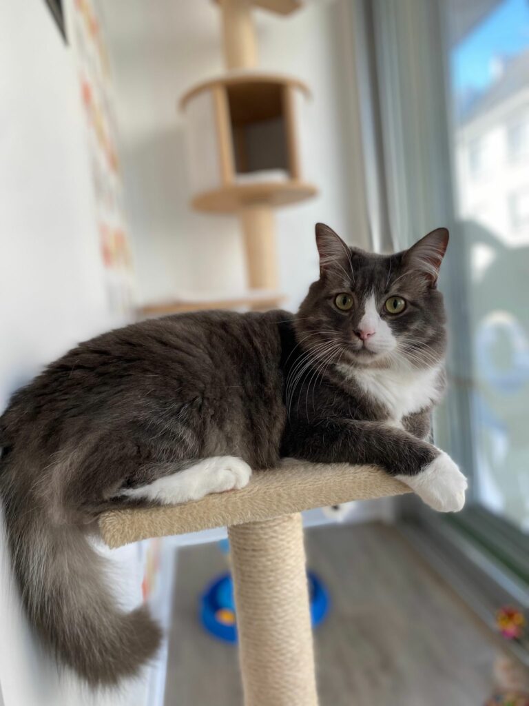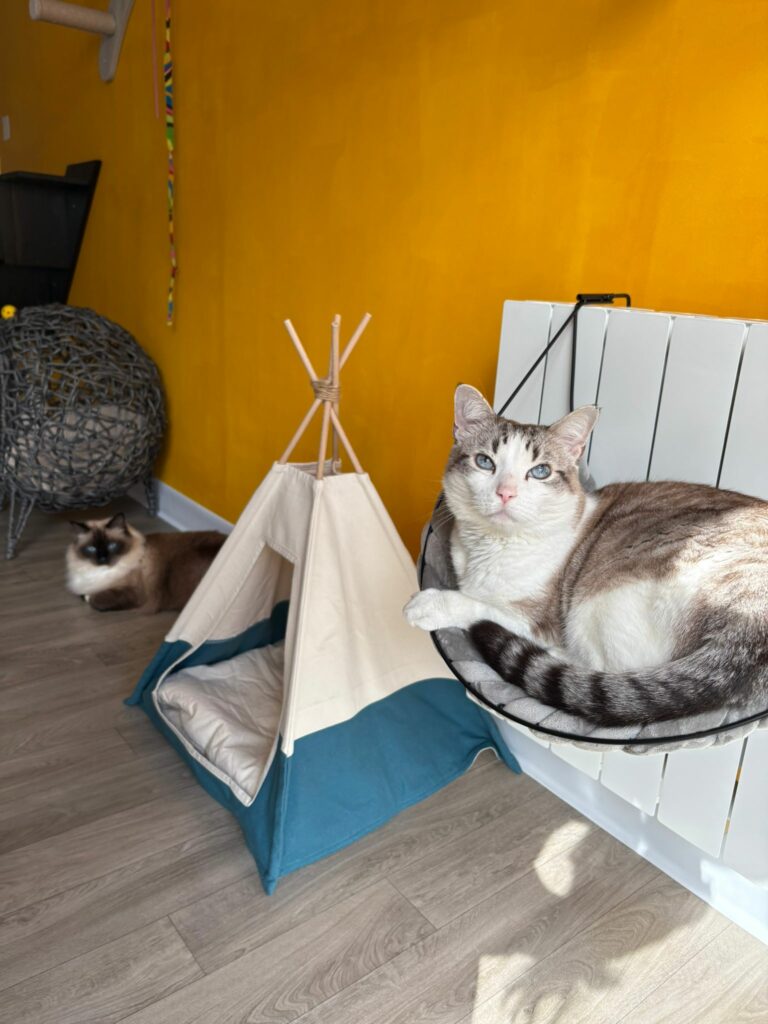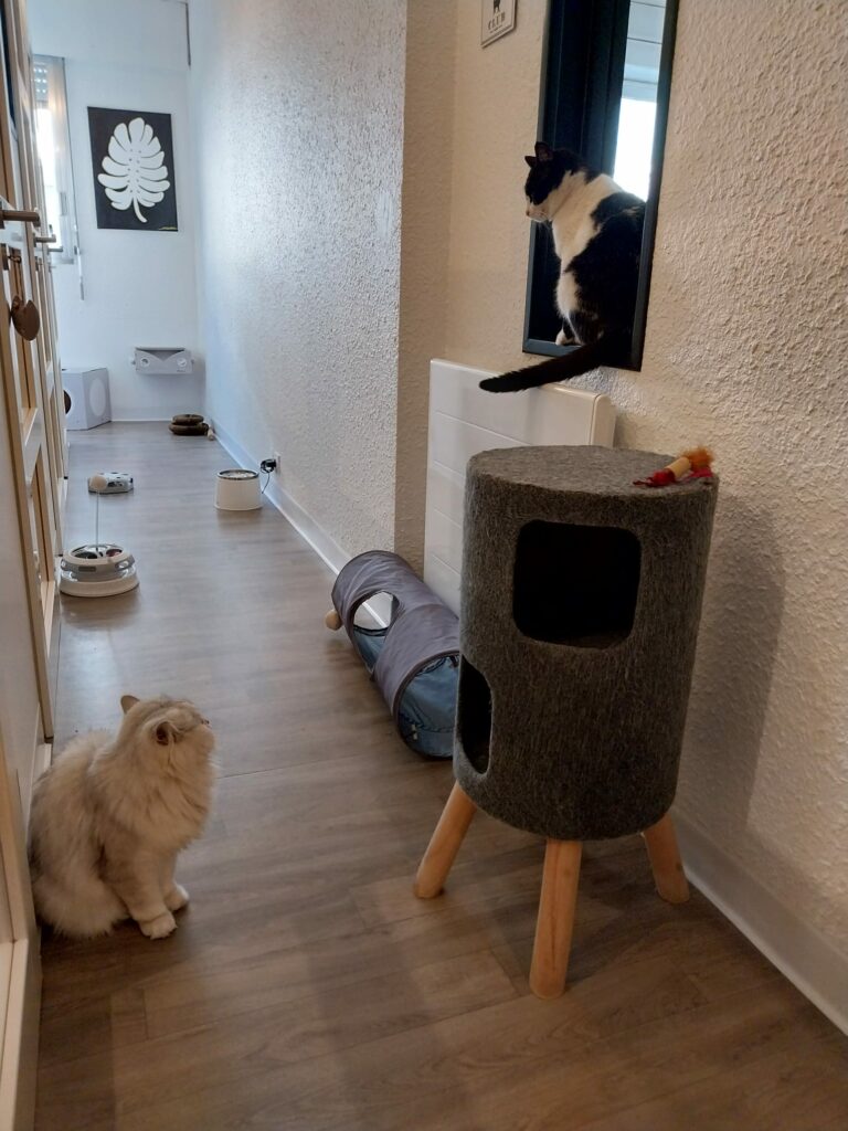 On y trouve pleins d’arbres à chats près des fenêtres, des tunnels, des tours à griffer de 1m50 et 1m70, des balles rebondissantes, des cannes à pêche, des jeux d’intelligence, des pots d’herbe à chat, et des fontaines à eau, tout le nécessaire pour satisfaire vos chats.